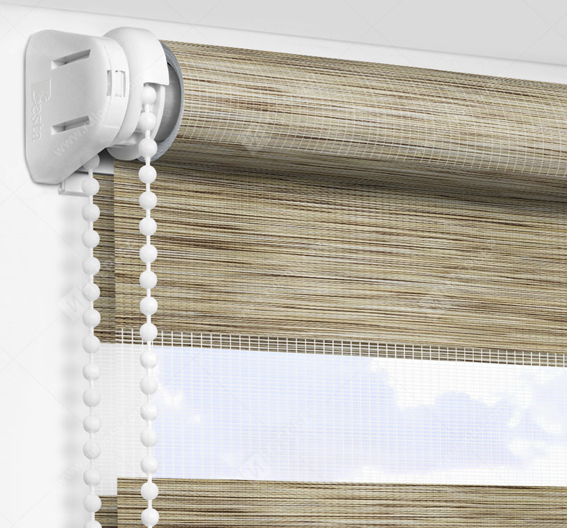 Рулонные шторы Зебра работают следующим образом: полоски ткани смещаются так, чтобы совпали светлые или темные слои, образуя, плотное или более прозрачное полотно. Так обеспечивается ночной или дневной режим затемнения. Также можно поднять шторное полотно полностью, открывая окно. По умолчанию - цвет фурнитуры белый.